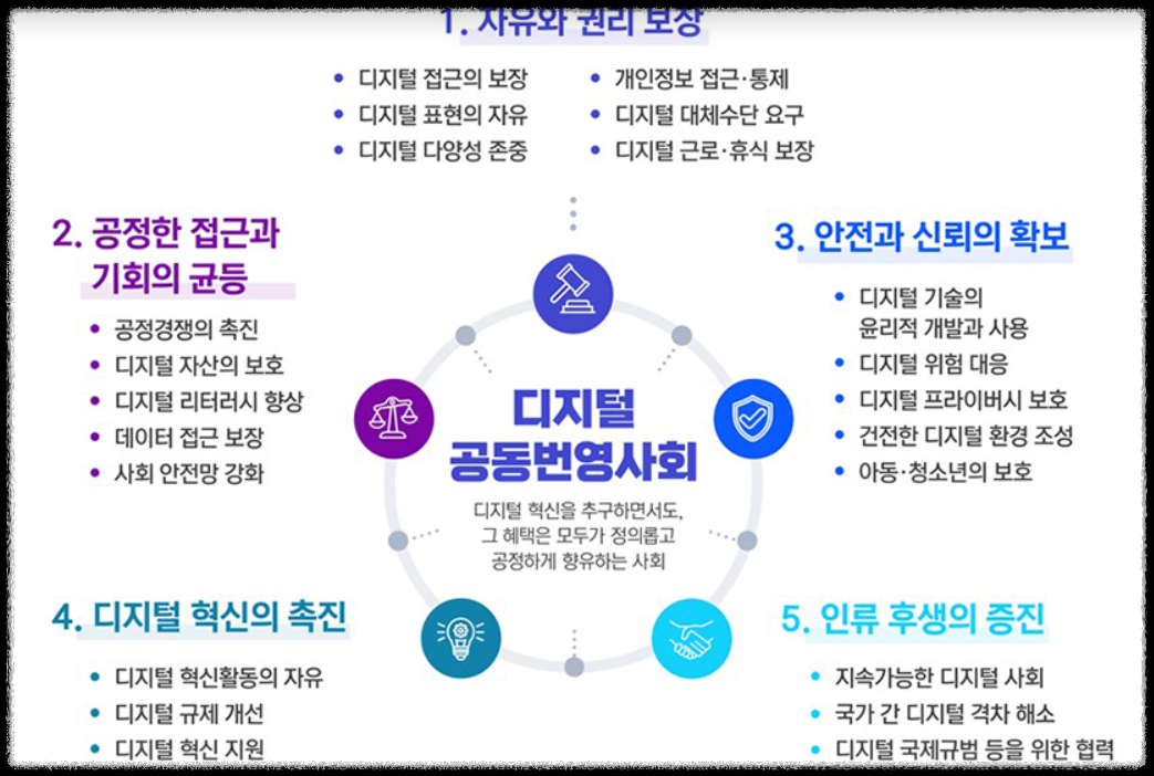 디지털 공동 번영 사회 구현을 위한 기본 원칙으로 디지털 환경에서의 자유와 권리 보장 디지털에 대한 공정한 접근과 기회의 균등 안전하고 신뢰할 수 있는 디지털 사회 자율과 창의 기반의 디지털 혁신의 촉진 인류 후생의 증진 등 총 다섯 가지를 규정하며 디지털 사회가 나아가야 하는 방향을 제시하고 있습니다.