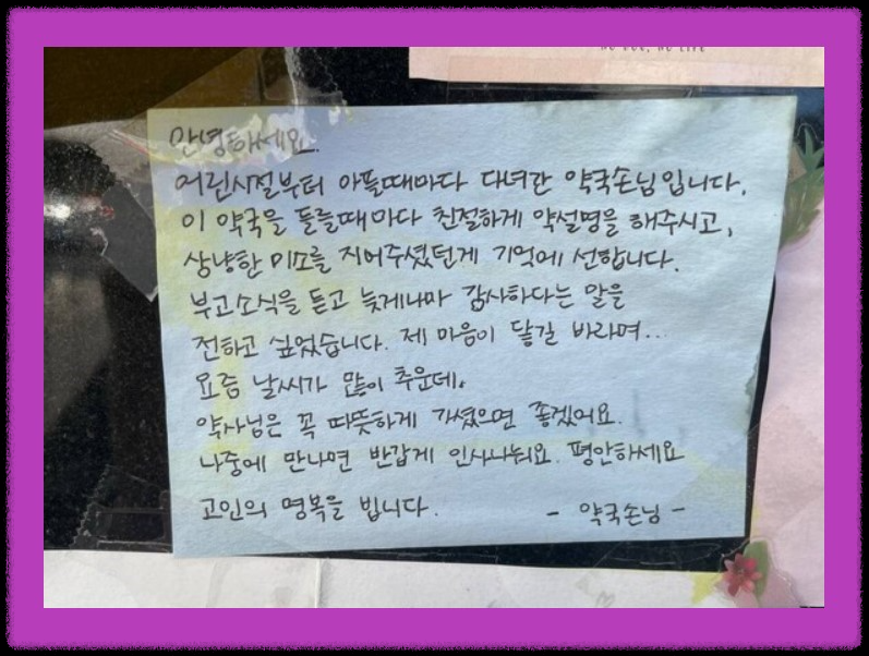 '동네의 등불' 같은 약사의 부고가 알려지면서 주민들은 저마다 老약사 부부와의 기억을 담은 쪽지를 약국 앞에 하나둘씩 붙이기 시작했습니다.