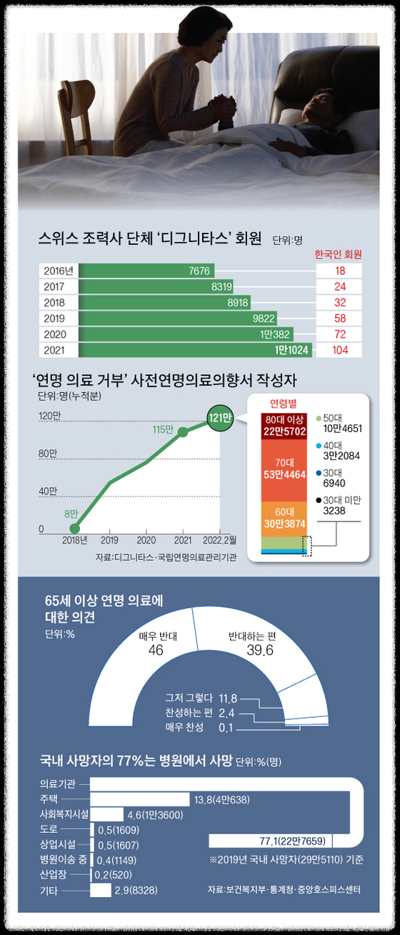 조력 사망 단체 <디그니타스; Dignitas>를 통해 생을 마감한 외국인은 3,400여 명이 넘으며, 한국인 회원도 120명에 달하는 것으로 알려졌습다.