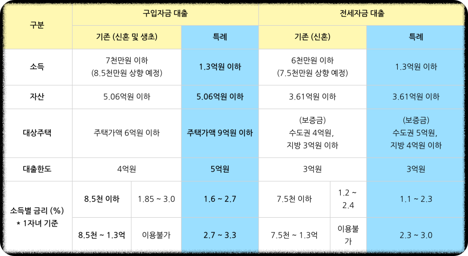 폭넓은 지원을 위해 소득 1.3억 원 이하 가구를 지원, 기존 대출 대비 주택 가액( 6억 → 9억),