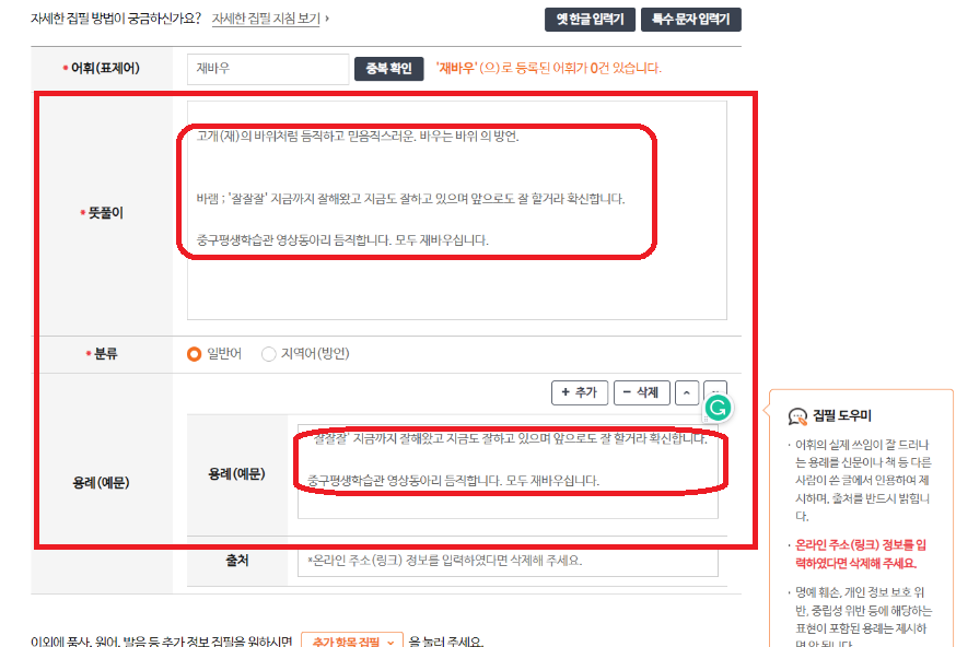 그래서 국립국어원의 회원으로 등록하고 재바우를 독자가 등록하고 필집을 요청하였습니다.