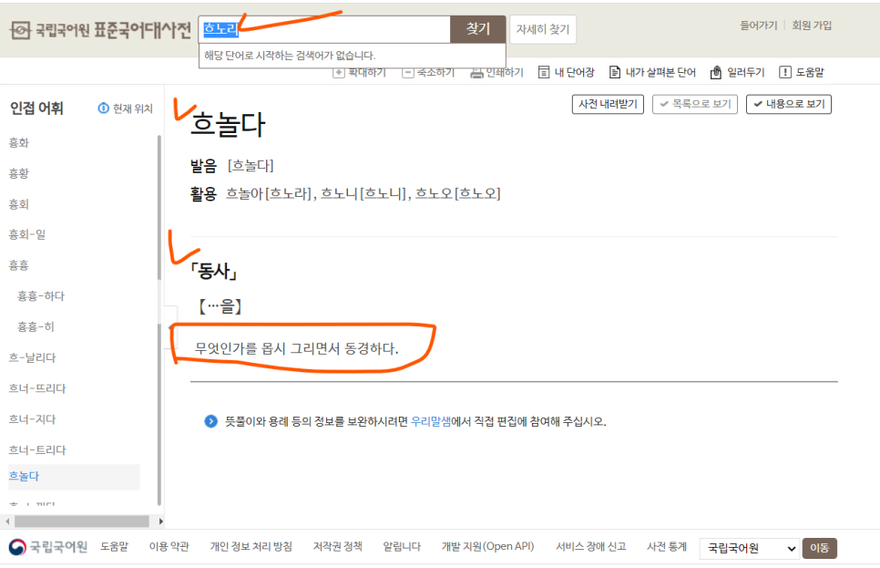 국립국어원 표준국어대사전을 검색하니 흐노니는 나오지 않고 흐놀다가 검색된다.